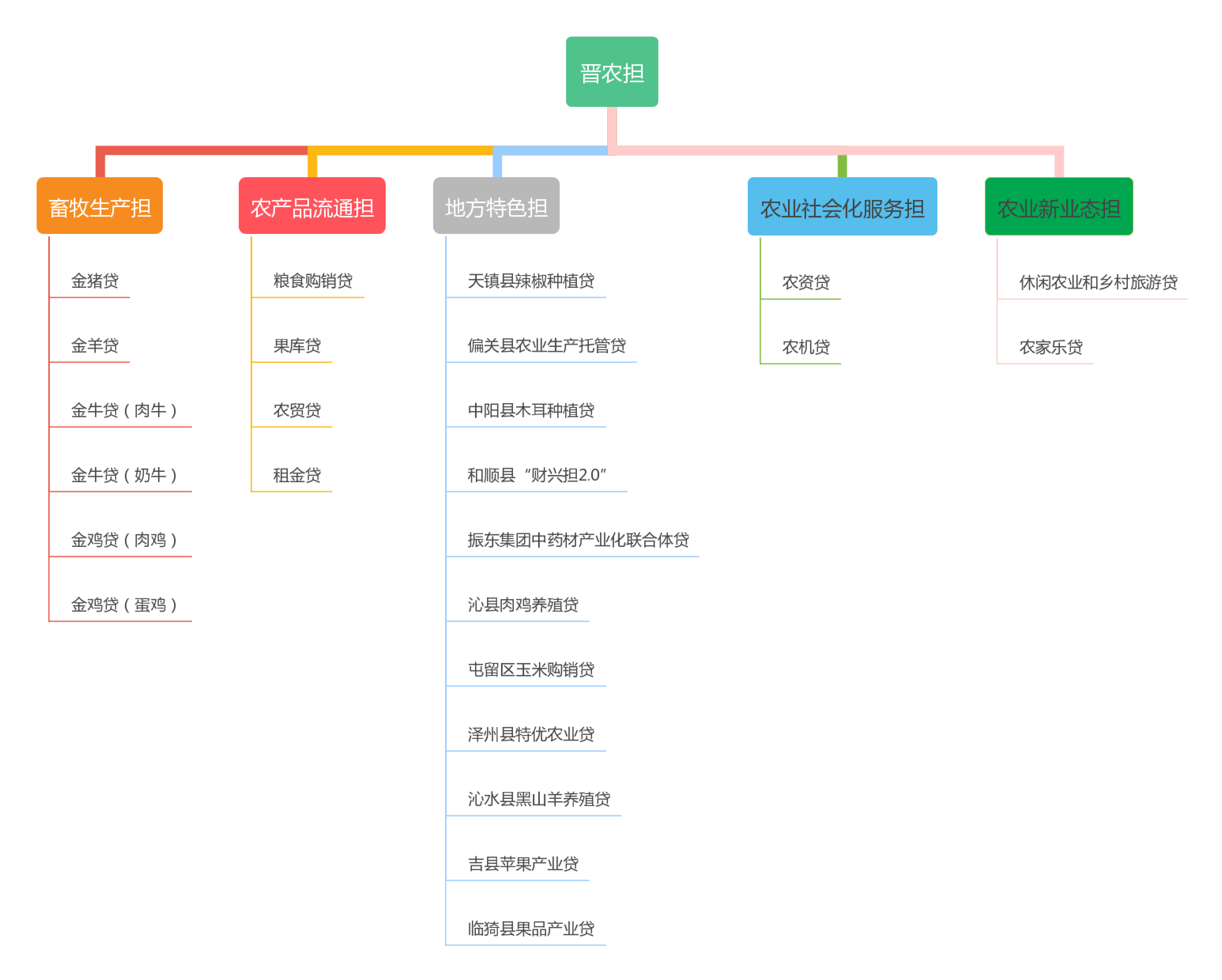 畜牧生產(chǎn)擔(dān)·金豬貸 畜牧生產(chǎn)擔(dān)·金羊貸 畜牧生產(chǎn)擔(dān)·金牛貸(肉牛) 畜牧生產(chǎn)擔(dān)·金牛貸(奶牛) 畜牧生產(chǎn)擔(dān)·金雞貸(肉雞) 畜牧生產(chǎn)擔(dān)·金雞貸(蛋雞) 農(nóng)產(chǎn)品流通擔(dān)·糧食購銷貸 農(nóng)產(chǎn)品流通擔(dān)·果庫貸 農(nóng)產(chǎn)品流通擔(dān)·農(nóng)貿(mào)貸 農(nóng)產(chǎn)品流通擔(dān)·租金貸 農(nóng)業(yè)社會化服務(wù)擔(dān)·農(nóng)資貸 農(nóng)業(yè)社會化服務(wù)擔(dān)·農(nóng)機貸 農(nóng)業(yè)新業(yè)態(tài)擔(dān)·休閑農(nóng)業(yè)和鄉(xiāng)村旅游貸 農(nóng)業(yè)新業(yè)態(tài)擔(dān)·農(nóng)家樂貸 地方特優(yōu)產(chǎn)業(yè)擔(dān)·天鎮(zhèn)縣辣椒種植貸 地方特優(yōu)產(chǎn)業(yè)擔(dān)·偏關(guān)縣農(nóng)業(yè)生產(chǎn)托管貸 地方特優(yōu)產(chǎn)業(yè)擔(dān)·中陽縣木耳種植貸 地方特優(yōu)產(chǎn)業(yè)擔(dān)·和順縣“財興擔(dān) 2.0” 地方特優(yōu)產(chǎn)業(yè)擔(dān)·振東中藥材產(chǎn)業(yè)化聯(lián)合體貸 地方特優(yōu)產(chǎn)業(yè)擔(dān)·沁縣肉雞養(yǎng)殖貸 地方特優(yōu)產(chǎn)業(yè)擔(dān)·屯留區(qū)玉米購銷貸 地方特優(yōu)產(chǎn)業(yè)擔(dān)·澤州縣特優(yōu)農(nóng)業(yè)貸 地方特優(yōu)產(chǎn)業(yè)擔(dān)·沁水縣黑山羊養(yǎng)殖貸 地方特優(yōu)產(chǎn)業(yè)擔(dān)·吉縣蘋果產(chǎn)業(yè)貸 地方特優(yōu)產(chǎn)業(yè)擔(dān)·臨猗縣果品產(chǎn)業(yè)貸